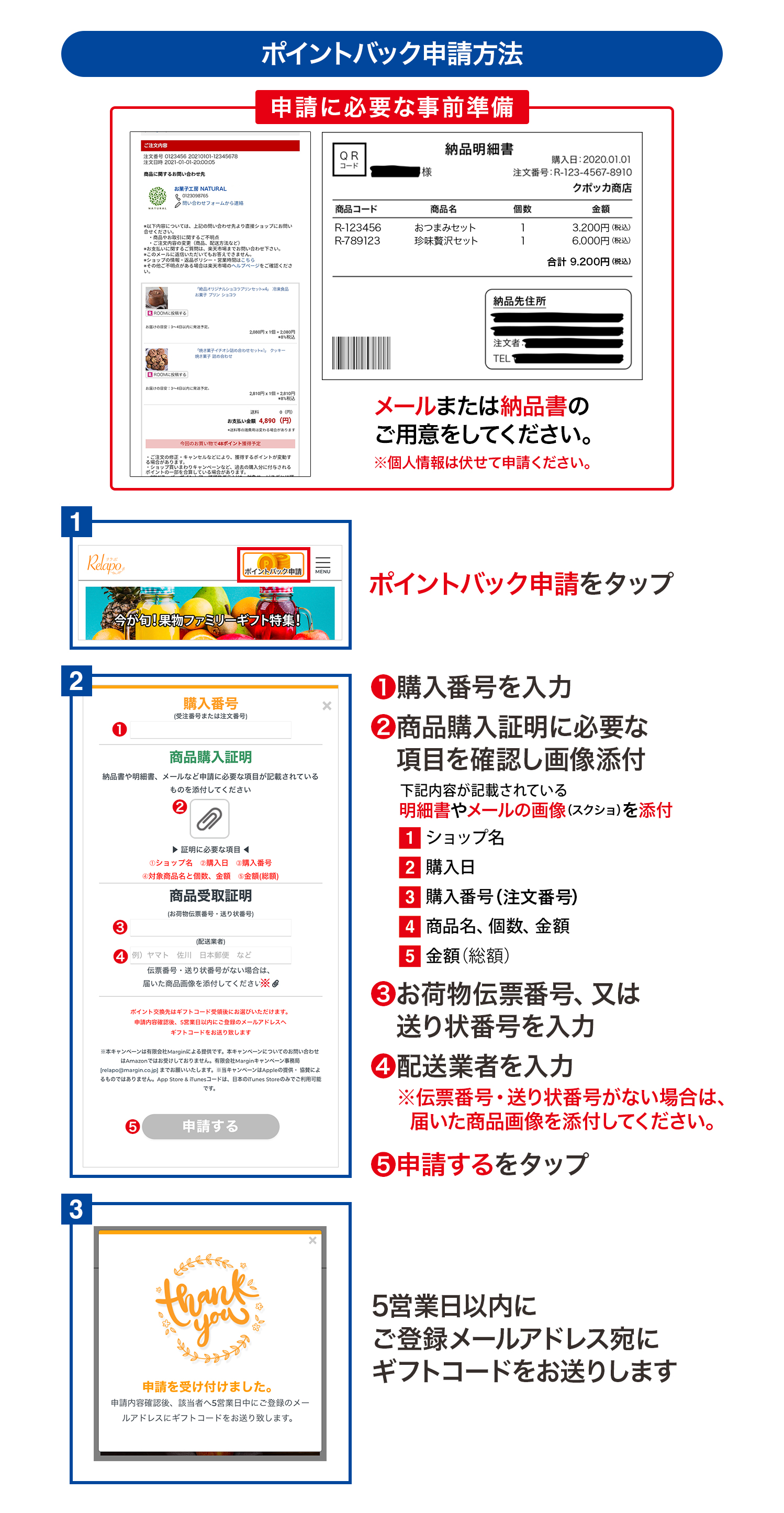 申請内容確認後、該当者へ5営業日中にご登録のメールアドレスにギフトコードをお送り致します。
