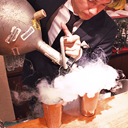 『液体窒素』-196℃の液体窒素を使うフローズンカクテルです。通常のフローズンと違い、水分が入らないため薄まらずに濃厚な味を楽しめるカクテルです。おすすめメニューは液体窒素のスイカソルティードッグです!『スモーキングマシーン』は瞬間燻製機を使用する燻香カクテルで、燻した香りがカクテルの味に奥深さを加えることに成功。こちらのおすすめカクテルは焙煎コーヒー風味のスモーキーラムマティーニです。