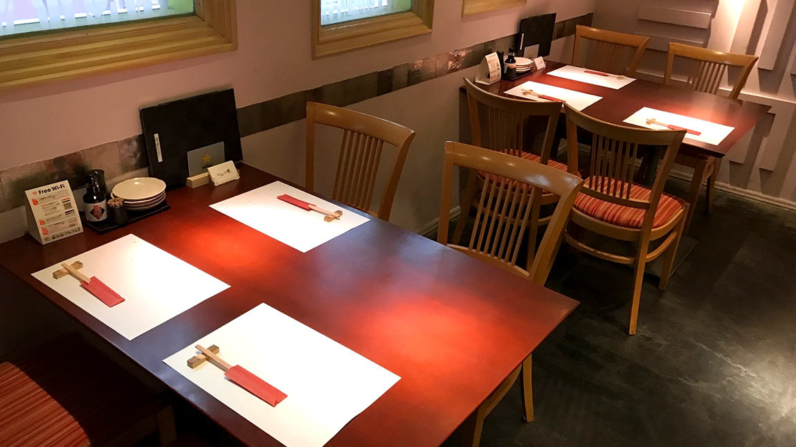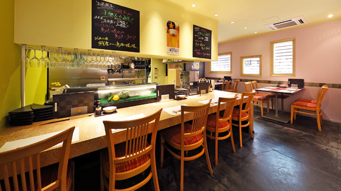 明るく清潔感ただよう広々とした店内は、カウンター、テーブル、半個室の全19席。仲間同士で他の方の目を気にせずに過ごしたい方には、8名~19名様まで貸切りも可能です。 会社帰りの1杯や友人との食事の利用はもちろん、かしこまりすぎない接待でもご利用いただけます。