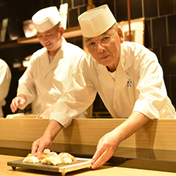 江戸前鮨に携わって50年以上。多くの弟子を育てた親方はとても気さくで、食事を楽しんでいると自然と場が笑顔にあふれる空間に。 『カウンターでのお鮨ははじめて』という方も気兼ねなく来店いただけるお店です。