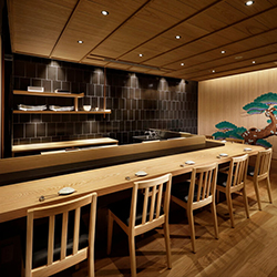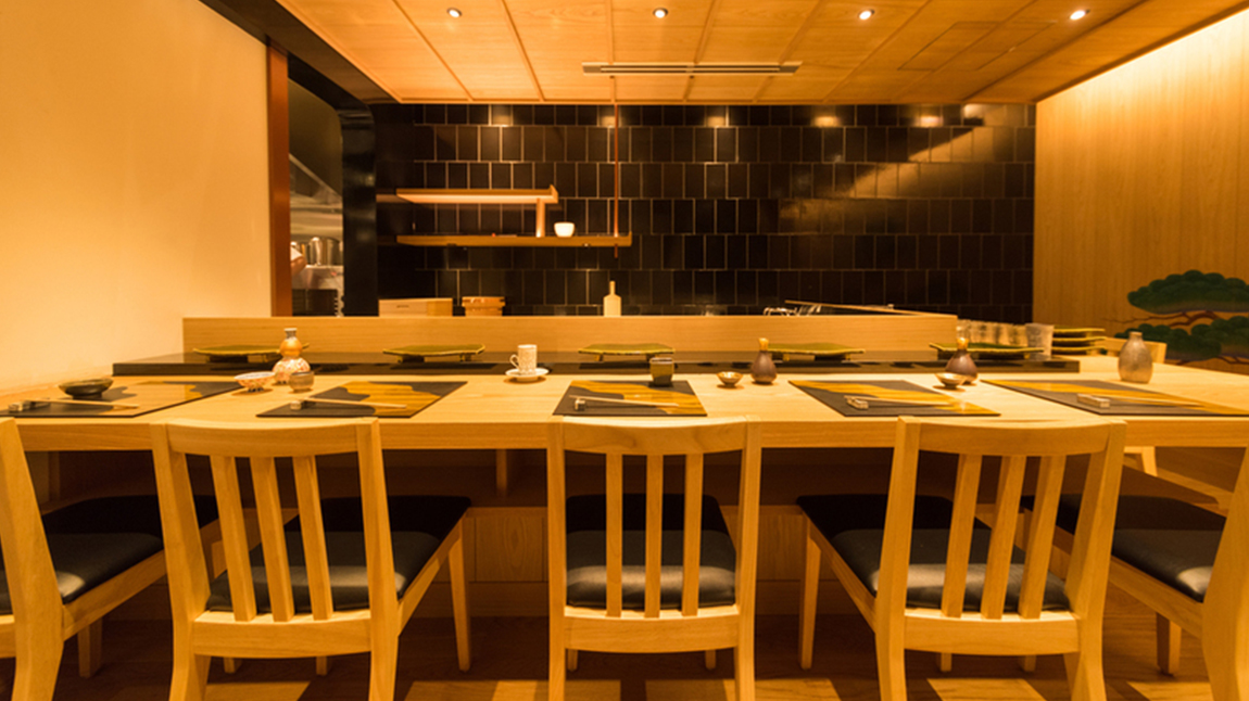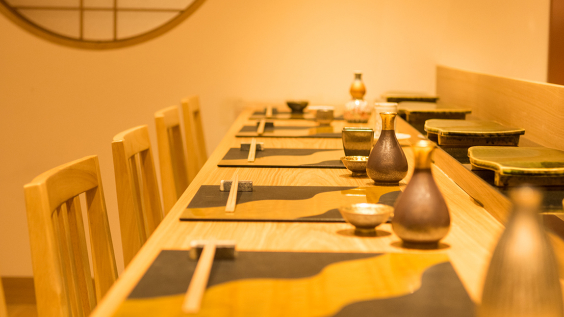 店内は日本舞踊の舞台を彷彿とさせる木目調の和の空間。席はカウンターの8席のみで、親方との会話やパフォーマンスをお楽しみいただけます。 また、接待や顔合わせで他のお客さまがいないほうがよいという方は、貸切りでのご利用も可能ですので、お気軽にご相談ください。