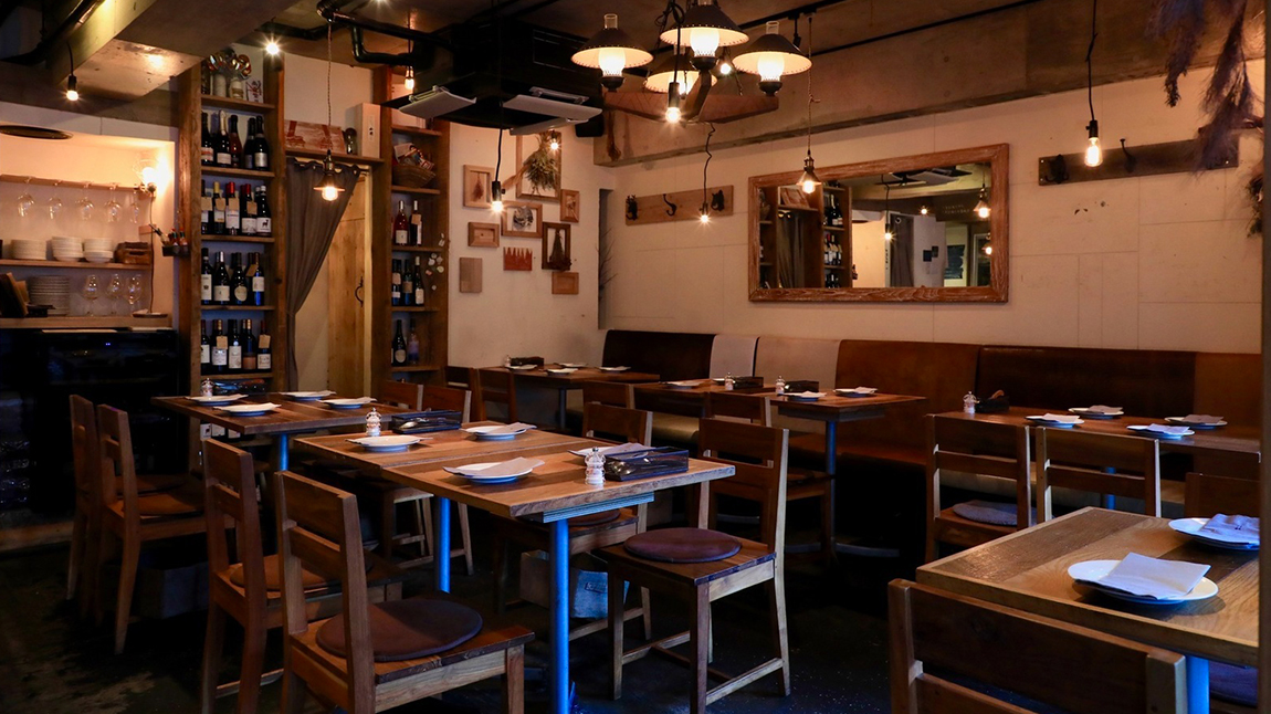 学芸大学駅より徒歩3分。ロッジ(山小屋)のような外観の店の中に入ると、木のぬくもりに包まれたくつろぎの空間が広がります。団体にもおすすめな広々としたテーブル席に、デートや一人呑みでもゆったり過ごせるソファのカウンター席も。休日に別荘へ訪れたような居心地のいい店内でお待ちしています。