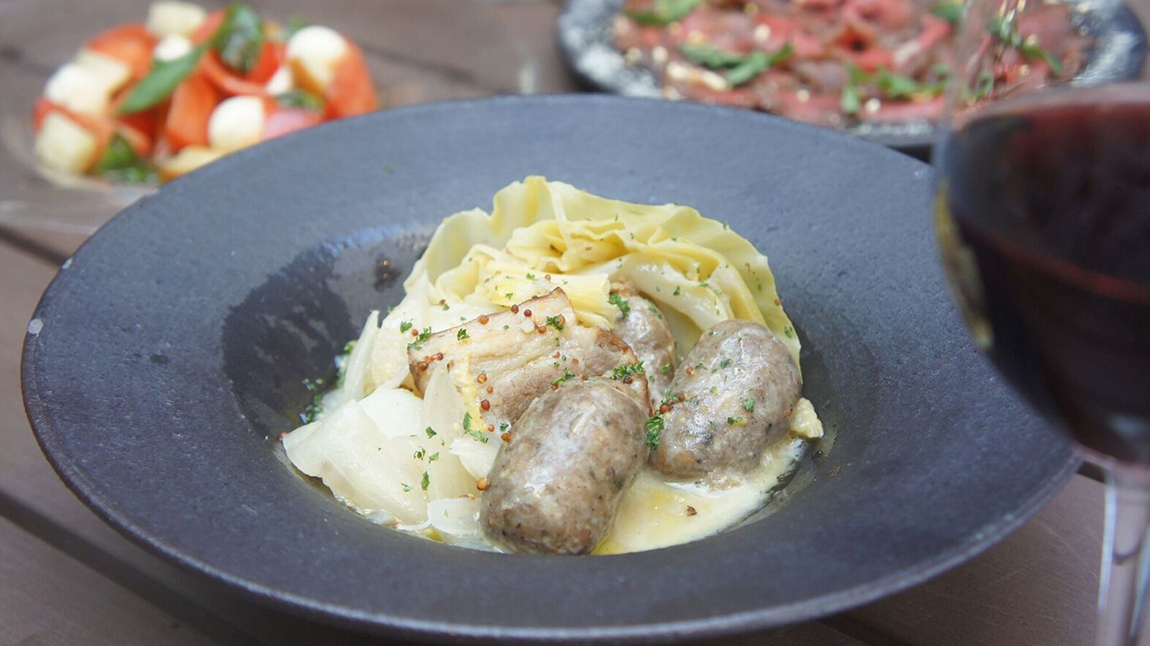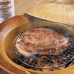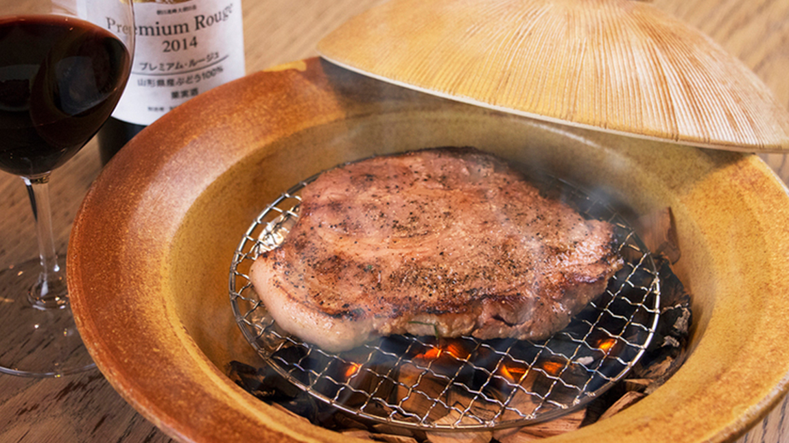 長野県安曇野市山中の放牧により育った肉質が良い豚を、ワインと合うように味付けし、オーブンでじっくりと焼き、仕上げにお客様の目の前で同産地の安曇野のリンゴの木のチップで瞬間燻製!芳醇な香りをまとわせご提供します。口に含んだときに広がる、柔らかく凝縮された旨味は絶品です。