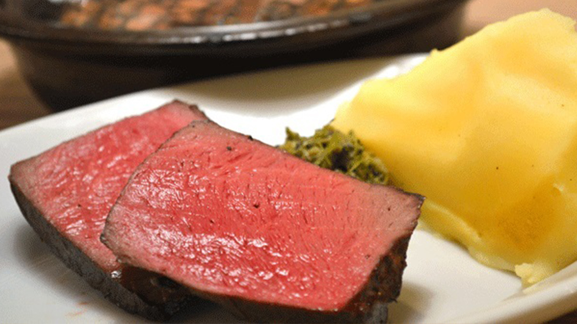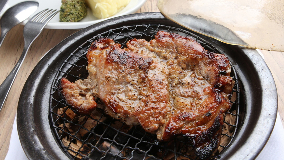 リンゴの木のチップで燻製することによってやさしい薫りと、余分な脂が落ちて凝縮された肉の旨みがぞんぶんに味わえる逸品に。 名物『瞬間燻製ステーキ』の豪快な見た目と最上級の味わいは必食のメニューです。