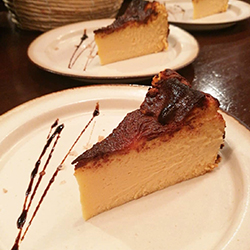お店自慢のデザート「バスクの黒いチーズケーキ」。 「焦げているけど大丈夫?」と思うかもしれませんが、実際はわざと焦がしているんです! 高温で焼いて表面を焦がすことにより、チーズの旨みがより凝縮された一品に。ほどよく酸味のきいた甘さのチーズケーキはフォークがすすむこと間違いなし! 持ち帰りで3号のホールもあるので、お土産にも◎